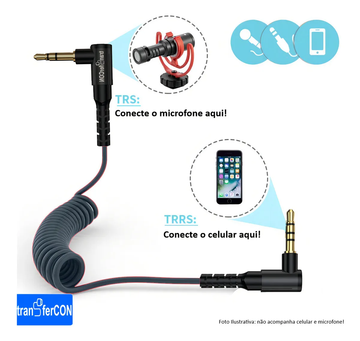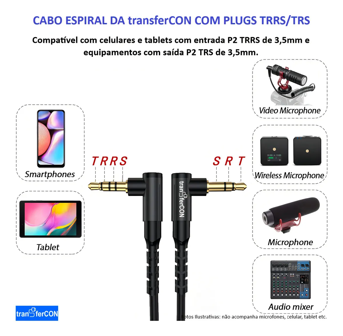 Cabo adaptador da transferCON P2 de 3,5mm Trs para trrs. Esse cabo tem a função de ligar um microfone que tem saída P2 em um celular smartphone. Ele funciona tanto em sistema Android como IOS (para celulares Apple é necessário usar um adaptador original para entrada de áudio).