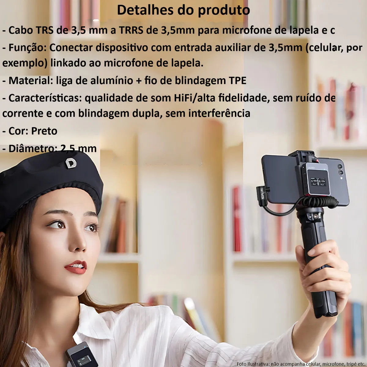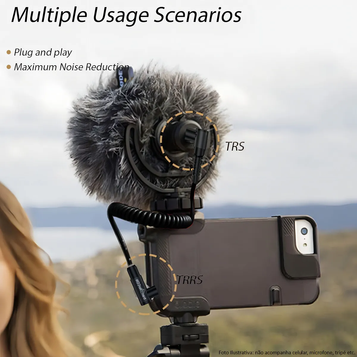 • Plug P2 de 3.5mm trs (3-vias) em uma ponta e P2 de 3,5mm trrs (4-vias) na outra, compatível com microfones RODE sc7 / BOYA / SYNCO / etc.