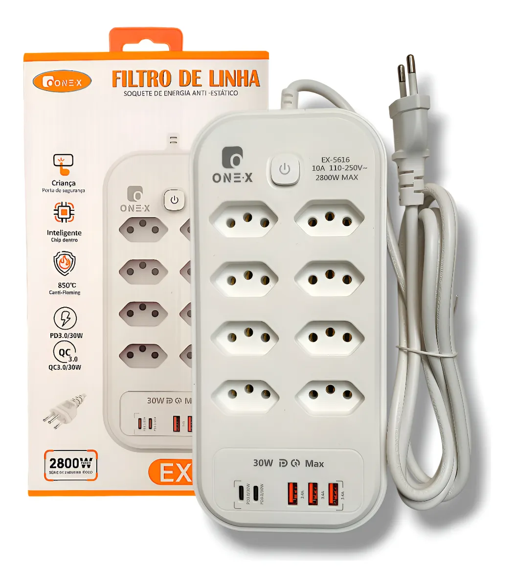 Filtro de Linha 8 Tomadas 5 Entradas USB 2800W 2 Metros Onex EX-5616