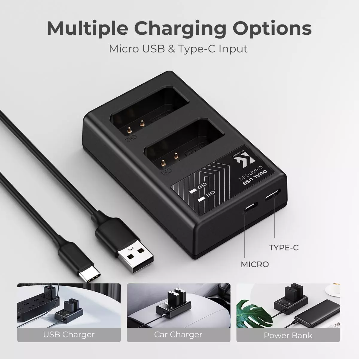 O carregador tem duas interfaces de entrada, Micro USB/Tipo C, e suporta uma variedade de opções de carregamento: pode ser carregado por meio de fonte de alimentação móvel, fonte de alimentação móvel/bateria, carregador USB e carregador de carro; oferecendo uma variedade de opções de carregamento Opção como carregador padrão.